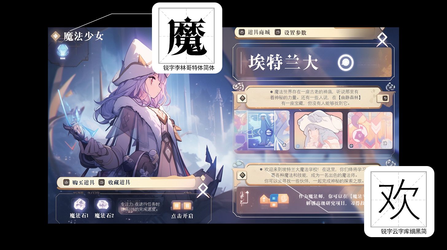 游戏中的字体不仅是文本的介绍,而且是游戏屏幕和氛围的重要组成部分。美丽的字体可以增强游戏的整体视觉效果,并增强游戏的沉浸感和体验。同时,文本还具有传输信息的功能,例如任务提示,字符名称,技能描述等。清晰易于阅读的字体允许玩家快速获取游戏信息并更好地理解和掌握游戏的内容。字体也是游戏品牌形象的重要组成部分。独特的字体可以增强游戏的识别和品牌形象,使玩家更容易记住和识别游戏。因此,如何选择游戏字体非常重要!